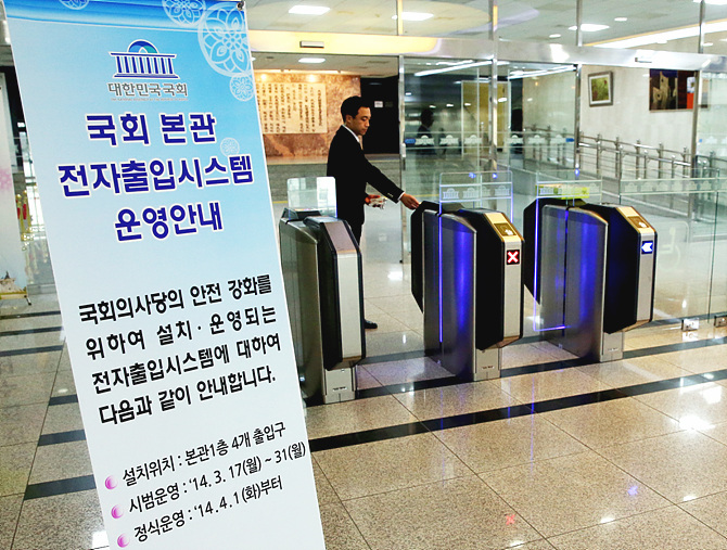 17일부터 시범운영을 시작하는 국회 본관 전자출입관리시스템이 다음달 1일 정식 운영되는 가운데, 관계자가 전자시스템을 직접 시연해 보이고 있다.