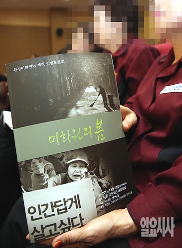 17일 오후 서울 여의도 국회 의원회관에서 신계륜 국회 환경노동위원장 주최로 열린 '환경미화원법 제정 입법토론회, 미화원의 봄'이 열린 가운데, 한 참석자가 관련 책자를 들어보이고 있다.