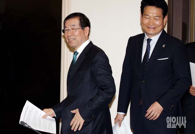 17일 서울 중구 프레스센터에서 열린 '제28차 전국시도지사협의회 총회'에서 박원순 서울시장(왼쪽)과 송영길 인천시장이 참석하고 있다.