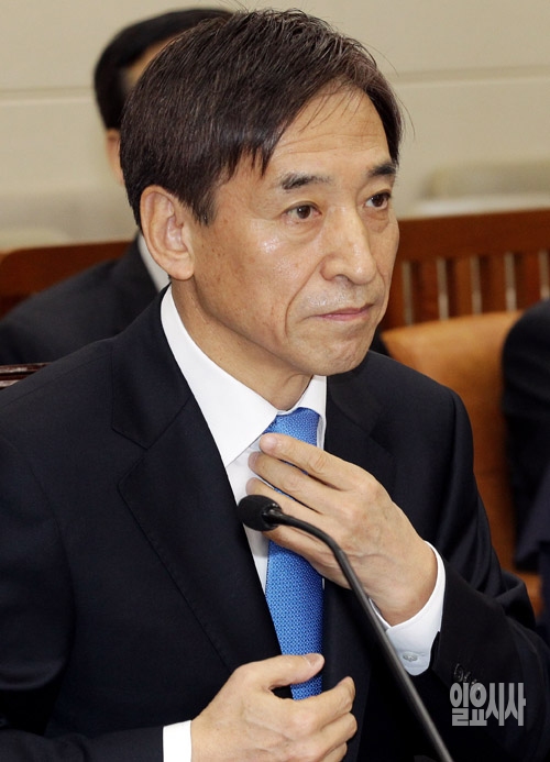 이주열 한국은행 총재 후보자가 19일 서울 여의도 국회에서 열린 인사청문회에서 넥타이를 고쳐 매고 있다.