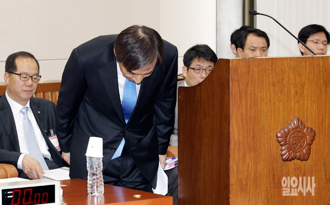 이주열 한국은행 총재 후보자가 19일 서울 여의도 국회에서 열린 인사청문회에서 모두발언을 마친 뒤 허리 숙여 인사하고 있다.