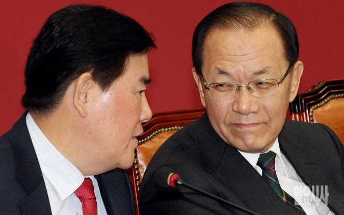 새누리당 황우여 대표(오른쪽)와 최경환 원내대표가 19일 서울 여의도 국회에서 열린 최고중진연석회의에서 이야기를 나누고 있다.