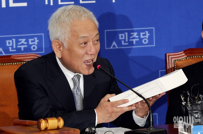 민주당 김한길 대표가 19일 서울 여의도 국회에서 열린 최고위원회의에서 교문위 야당 간사인 유기홍 의원에게 '친일독재 미화 역사교과서와 맞선 153일의 기록'이란 책을 받은 뒤 발언을 하고 있다.