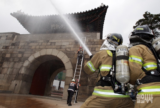 19일 서울 중구 광희문에서 중구소방서 대원들이 문화재 화재 초기대응을 위한 합동소방훈련을 하고 있다.
