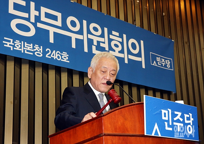19일 오전, 민주당 김한길 대표가 서울 여의도 국회에서 열린 당무위원회의 개의를 알리는 의사봉을 두드리고 있다.