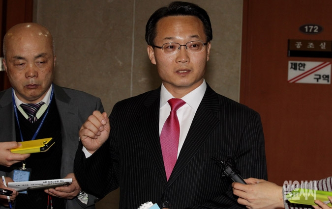 조해진 국회 미래창조과학방송통신위원회 새누리당 간사가 21일 서울 여의도 국회 정론관에서 원자력방호방재법 처리무산 기자회견을 마친 뒤 백브리핑을 하고 있다.