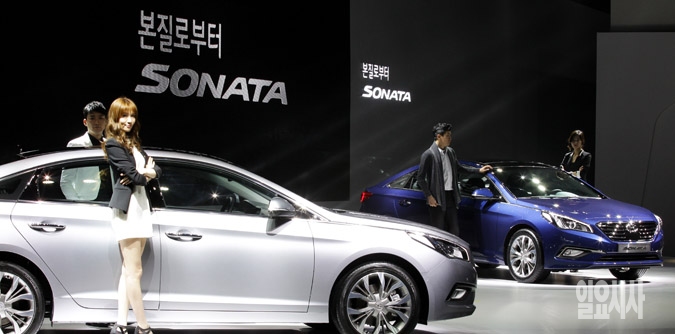 현대자동차가 24일 서울 삼성동 코엑스에서 7세대 모델로 새롭게 진화한 '신형 쏘나타'를 공개하고 있다. 이번에 출시된 '신형 쏘나타'는 디자인과 주행성능, 안전성에 이르는 전 부문에서 현대차의 최신 기술력이 모두 집약된 월드 프리미엄 중형 세단이다.