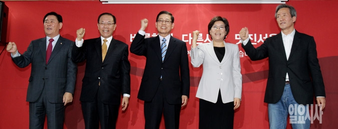 새누리당 서울시장 예비후보인 김황식 전 국무총리(가운데)가 24일 서울 여의도 대하빌딩에서 열린 자신의 선거사무소 개소식에서 참석자들과 함께 파이팅을 외치고 있다. 사진 왼쪽부터 최경환 원내대표, 황우여 대표, 김 전 총리, 이혜훈, 정몽준 예비후보.