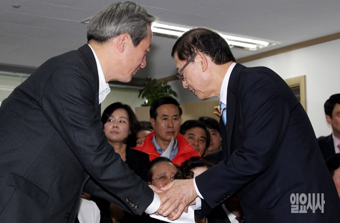 새누리당 서울시장 예비후보인 김황식 전 국무총리(오른쪽)가 24일 서울 여의도 대하빌딩에서 열린 자신의 선거사무소 개소식에서 정몽준 예비후보와 악수를 나누고 있다.