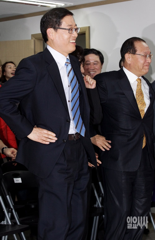 새누리당 서울시장 예비후보인 김황식 전 국무총리가 24일 서울 여의도 대하빌딩에서 열린 자신의 선거사무소 개소식에서 크레용팝의 노래에 맞춰 춤을 추고 있다.