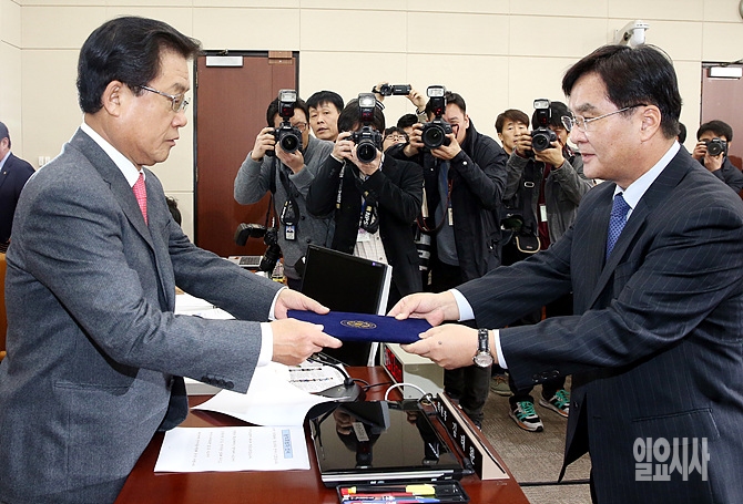 24일 오전, 강병규 안전행정부 장관 후보자가 서울 여의도 국회에서 열린 인사청문회에 출석해 김태환 위원장(사진 왼쪽)에게 선서문을 건네고 있다.