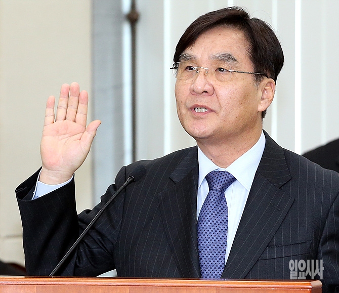 24일 오전, 강병규 안전행정부 장관 후보자가 서울 여의도 국회에서 열린 인사청문회에 출석해 선서하고 있다.