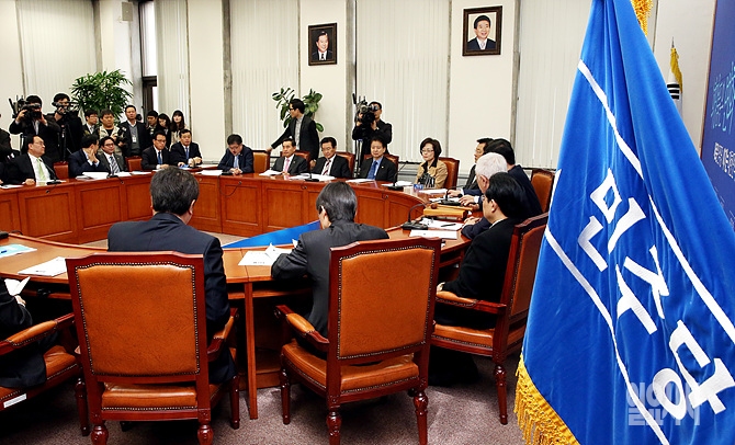 25일 오전, 서울 여의도 국회에서 민주당 김한길 대표·전병헌 원내대표 등이 참석한 가운데 마지막 최고위원회의가 열리고 있다.
