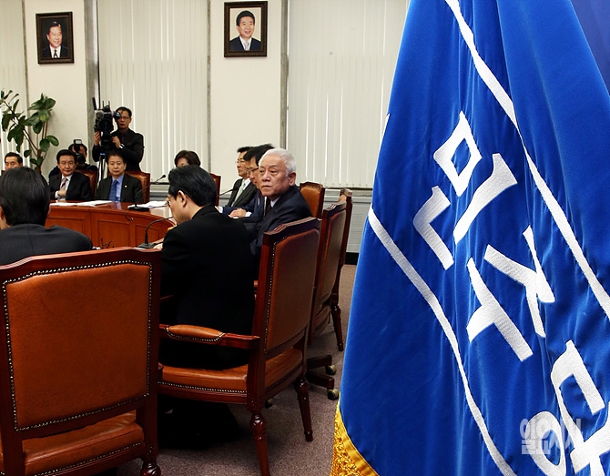 민주당 김한길 대표가 25일 오전, 서울 여의도 국회에서 전병헌 원내대표 등이 참석한 가운데 마지막 최고위원회의를 진행하던 도중 잠시 생각에 잠겨 있다.
