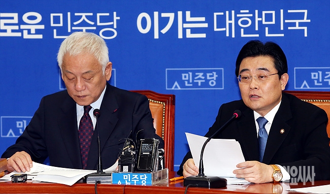 민주당 전병헌 원내대표(사진 오른쪽)가 25일 오전, 서울 여의도 국회에서 열린 마지막 최고위원회의에서 발언하고 있다.
