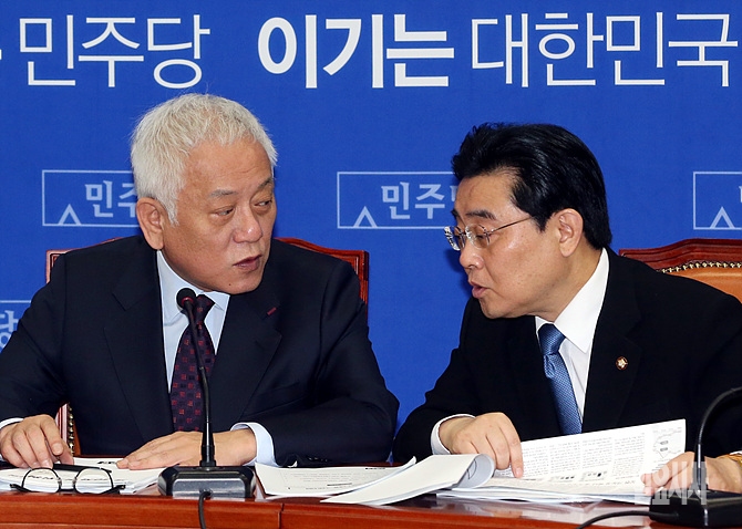 민주당 김한길 대표(사진 왼쪽)가 25일 오전, 서울 여의도 국회에서 열린 마지막 최고위원회의에서 전병헌 원내대표와 이야기를 나누고 있다.