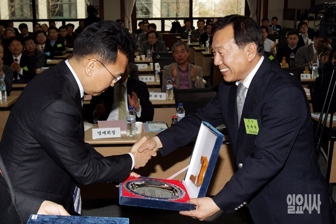 25일 서울 여의도 중소기업중앙회에서 열린 개성공단기업협회 정기총회에서 한재권 회장(오른쪽)이 임을출 경남대 극동문제연구소 교수에게 협회장 감사패를 수여하고 있다.
