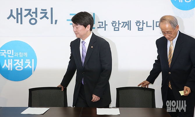 안철수 새정치연합 중앙운영위원장(사진 왼쪽)과 윤여준 의장이 25일 오후, 서울 여의도 새정치연합 회의실에서 마지막 중앙운영위원회의를 갖기 위해 입장하고 있다.