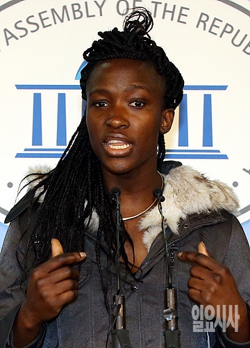 25일, 아프리카예술박물관 피해 노동자 마리아씨가 국회 정론관에서 민주당 을지로위원회와 아프리카예술박물관의 합의 사항 이행 촉구 기자회견을 하고 있다.