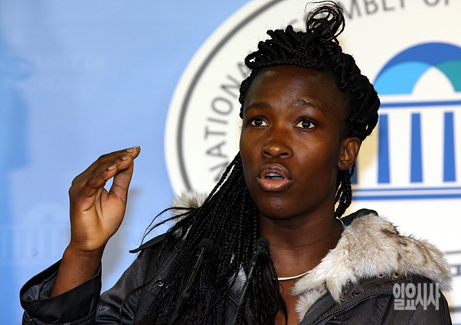 25일 오후, 아프리카예술박물관 피해 노동자 마리아씨가 국회 정론관에서 민주당 을지로위원회와 아프리카예술박물관의 합의 사항 이행 촉구 기자회견을 하고 있다.