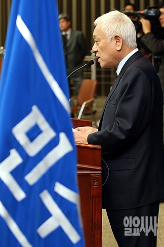 김한길 민주당 대표가 25일 오전 새정치민주연합 중앙당 창당대회를 하루 앞두고 열린 마지막 의원총회서 모두발언하고 있다.