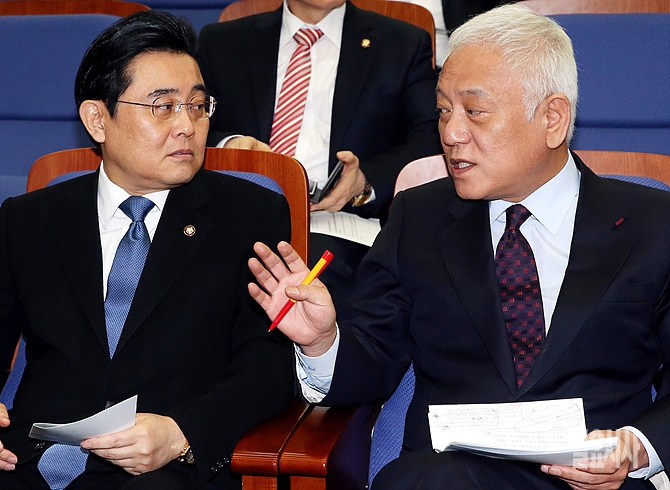김한길 민주당 대표(사진 오른쪽)가 25일 오전, 새정치민주연합 중앙당 창당대회를 하루 앞두고 열린 마지막 의원총회에서 전병헌 원내대표와 이야기를 나누고 있다.
