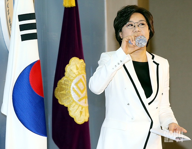 이혜훈 새누리당 서울시장 예비후보가 25일, 국회 정론관 사납금 제도 개선책 등 법인택시근로자 복지 대책 기자회견 도중 목이 타는 듯 물을 들이키고 있다.