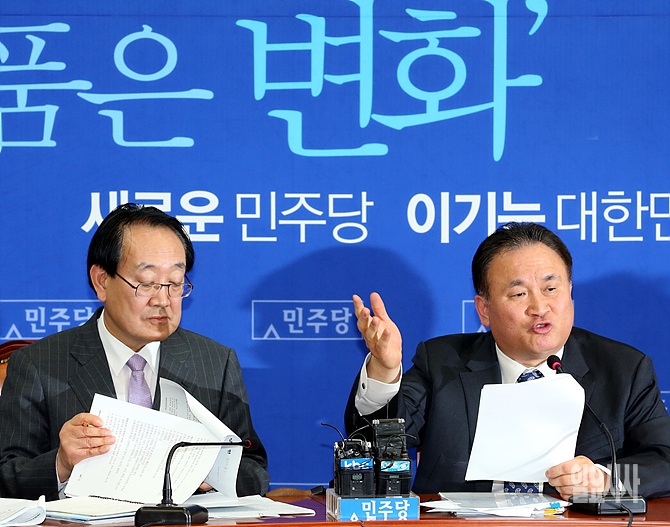 신당추진단 소속 민주당 이상민(사진 오른쪽)이 25일, 서울 여의도 국회에서 당헌·당규와 관련 기자설명회에서 발언하고 있다.