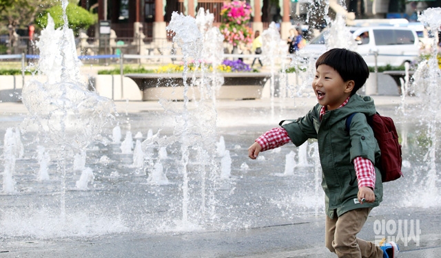 14일 연일 계속되는 무더운 날씨가 이어지는 가운데 서울 광화문광장 분수를 찾은 한 어린이가 더위를 식히고 있다.