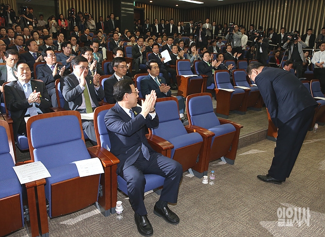 14일 오후, 서울 여의도 국회에서 열린 새누리당 의원총회에서 황우여 대표가 대표직 사퇴 발표 직후 동료 선후배 의원들을 향해 인사하고 있다.
