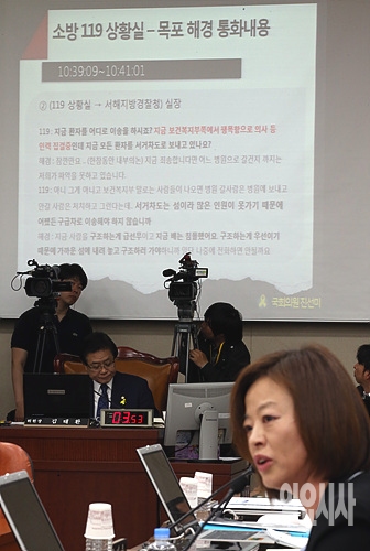 14일 오후, 서울 여의도 국회에서 열린 세월호 대책 관련 안행부 전체회의에서 새정치민주연합 진선미 의원이 사고 당시의 119상황실과 목포해경간의 통화내용에 대해 질문하고 있다.