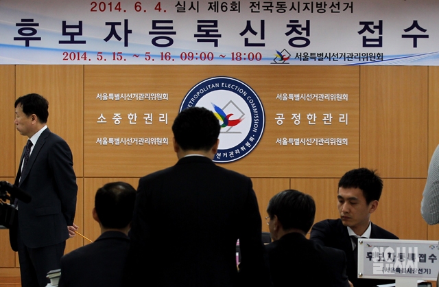 전국동시지방선거 후보자 등록 신청 접수 첫날인 15일 서울 종로구 서울시선거관리위원회의에서 후보들이 등록을 하고 있다.