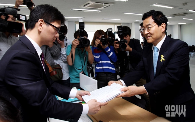 고승덕 서울시교육감 후보가 15일 서울 종로구 서울시선거관리위원회의에서 후보등록을 하고 있다.