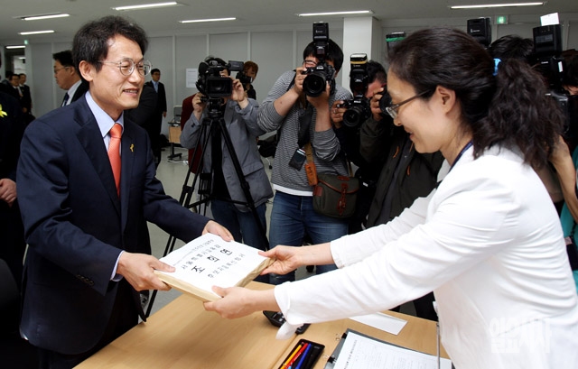 조희연 서울시교육감 후보가 15일 서울 종로구 서울시선거관리위원회의에서 후보등록을 하고 있다.