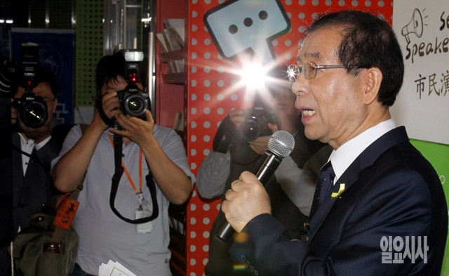 박원순 서울시장 후보가 15일 서울시청에서 서울시장 출마선언 기자회견을 갖고 있다.