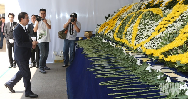 박원순 서울시장 후보가 15일 서울광장에 마련된 세월호 침몰사고 희생자 분향소를 찾아 헌화하고 있다.