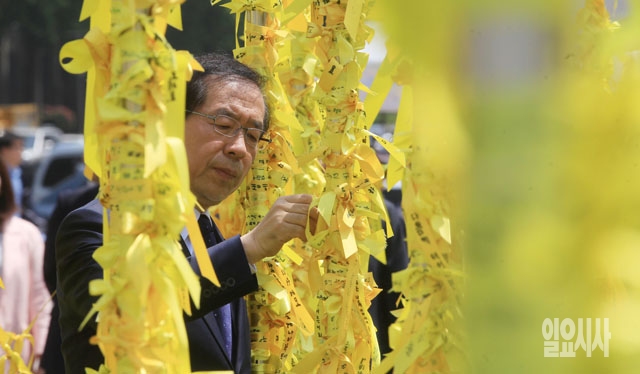 박원순 서울시장 후보가 15일 서울광장에 마련된 세월호 침몰사고 희생자를 추모하는 '노란 리본의 정원'을 둘러보고 있다.