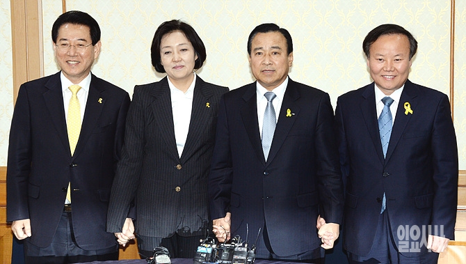 이완구 새누리당 원내대표(사진 오른쪽에서 첫 번째)-김재원 원내수석부대표(사진 오른쪽)와 박영선 새정치민주연합 원내대표-김영록 원내수석부대표(사진 왼쪽)가 15일 국회 귀빈식당에서 열린 여야원내 4자회동에서 손을 맞잡은 채 기념촬영을 하고 있다.