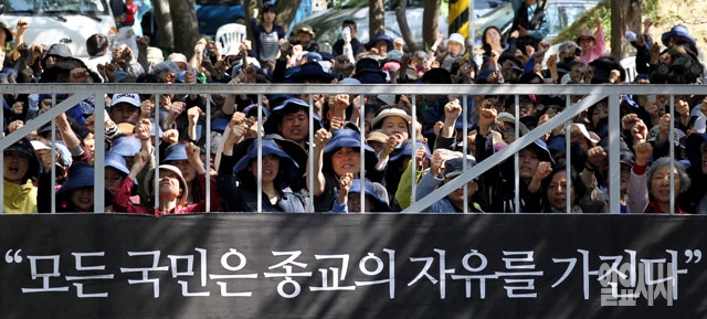 15일 경기도 안성시 금수원 정문 앞에서 기독교복음침례회(구원파) 신도들이 입구를 봉쇄한 뒤 구호를 외치고 있다.