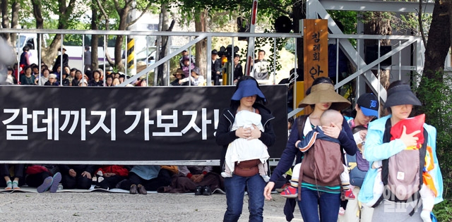 16일 유병언 전 세모그룹 회장이 검찰 소환에 불응한 가운데 이날 유 전 회장이 숨어있는 곳으로 알려진 경기도 안성시 금수원 정문 앞에 기독교복음침례회(구원파) 신도들이 모여 입구를 봉쇄하고 있다.