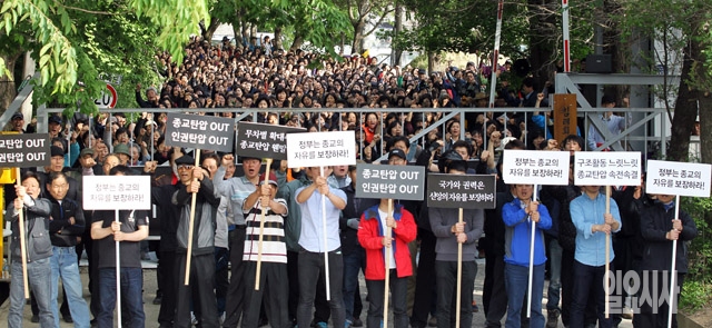 16일 유병언 전 세모그룹 회장이 검찰 소환에 불응한 가운데 이날 유 전 회장이 숨어있는 곳으로 알려진 경기도 안성시 금수원 정문 앞에서 기독교복음침례회(구원파) 신도들이 구호를 외치고 있다.