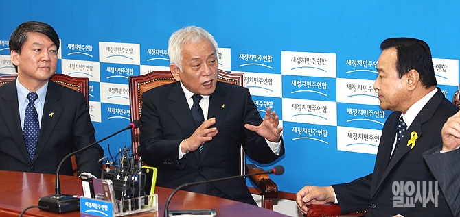 19일 오전, 새누리당 이완구 원내대표가 서울 여의도 국회에서 김한길·안철수 새정치민주연합 공동대표와 회동에서 이야기를 나누고 있다.