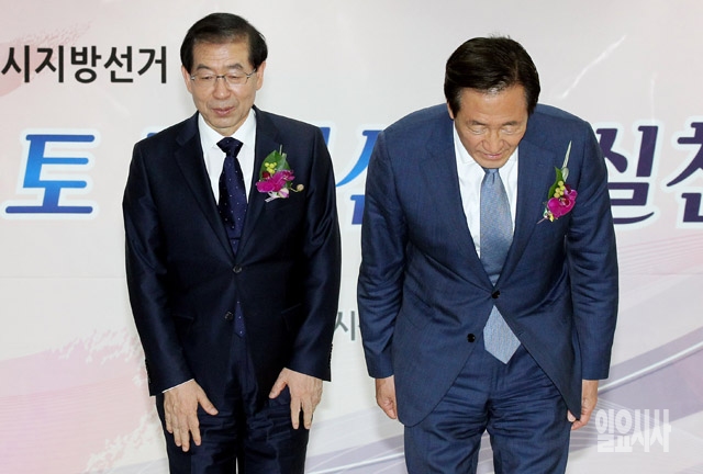정몽준 새누리당 서울시장 후보(오른쪽)와 박원순 새정치민주연합 서울시장 후보가 19일 서울 종로구 서울시선거관리위원회에서 열린 매니페스토 정책선거 실천 협약식에 참석해 인사하고 있다.