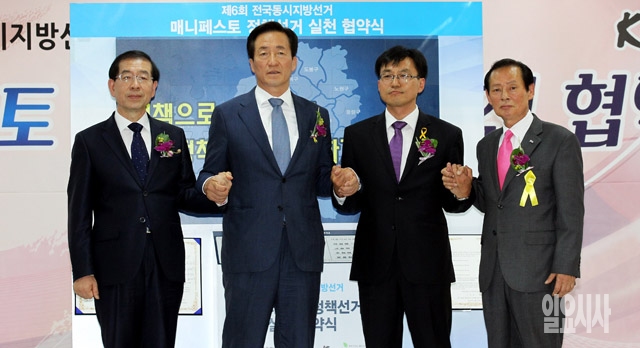 19일 서울 종로구 서울시선거관리위원회에서 열린 매니페스토 정책선거 실천 협약식에 참석한 서울시장 후보들이 손을 잡고 기념촬영을 하고 있다. 사진 왼쪽부터 박원순 새정치민주연합 후보, 정몽준 새누리당 후보, 정태흥 통합진보당 후보, 홍정식 새정치당 후보.