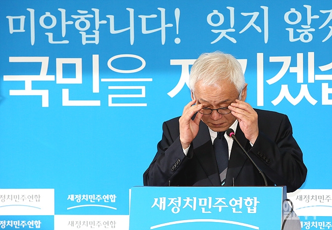 19일, 김한길 새정치민주연합 공동대표가 국회에서 이날 오전에 있었던 박근혜 대통령의 세월호 대국민 담화와 관련해 기자회견 도중 안경을 고쳐쓰고 있다.