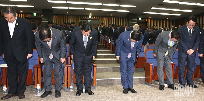 20일 오전, 서울 여의도 국회에서 열린 새누리당 의원총회 직전, 김무성(사진 왼쪽) 등 새누리당 의원들이 세월호 참사와 관련해 잠시 고개숙여 사과하고 있다.