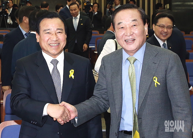 20일 오전, 서울 여의도 국회에서 열린 새누리당 의원총회 직전, 새누리당 이완구 원내대표가 서청원 의원과 악수를 나누고 있다.
