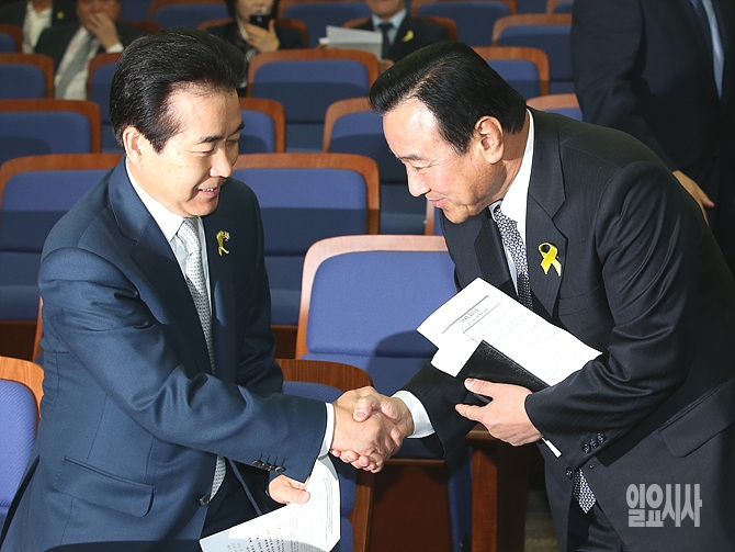 20일 오전, 서울 여의도 국회에서 열린 새누리당 의원총회 직전, 새누리당 이완구 원내대표가 나성린 의원(사진 왼쪽)과 악수를 나누고 있다.