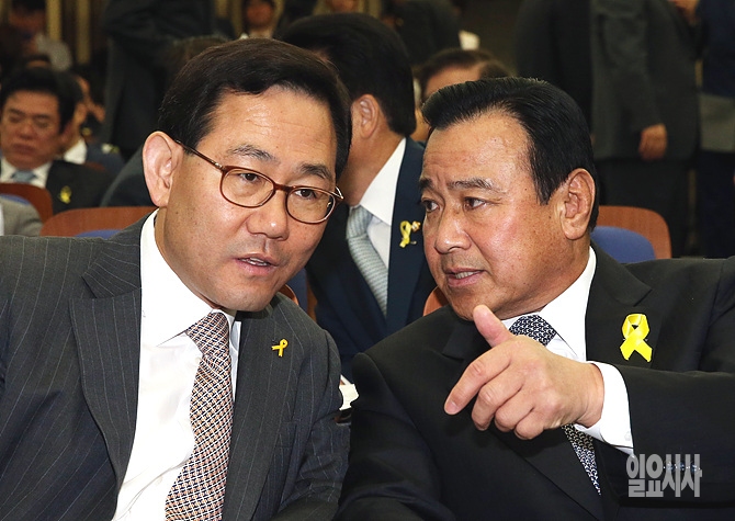 20일 오전, 서울 여의도 국회에서 열린 새누리당 의원총회 도중 새누리당 이완구 원내대표가 주호영 정책위의장과 이야기를 나누고 있다.