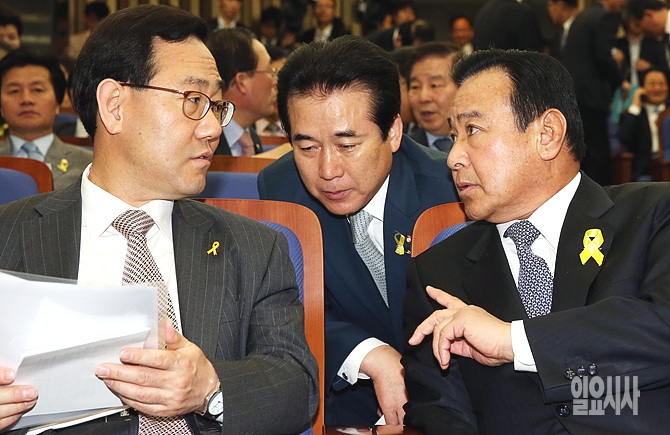 20일 오전, 서울 여의도 국회에서 열린 새누리당 의원총회 도중, 이완구 원내대표(사진 오른쪽)가 나성린 전 정책위의장(사진 가운데)·현 주호영 정책위의장과 이야기를 나누고 있다.